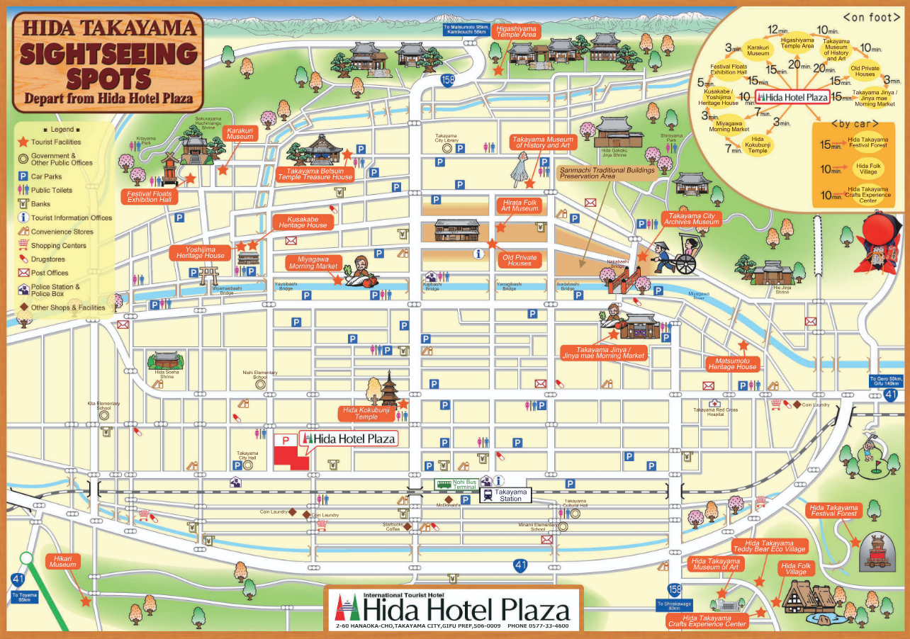 En dehors de la promenade dans les ruelles et de la montée à l'observatoire, vous pourrez goûter aux spécialités locales, notamment le célèbre bœuf de Hida en brochettes, ainsi qu'explorer les petites boutiques d'artisanat qui vendent des objets typiques de la région (poupées sarubobo, chapeaux en bambou, brosses shuro et bien d'autres choses).