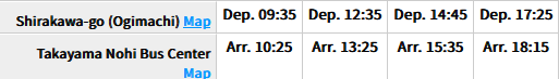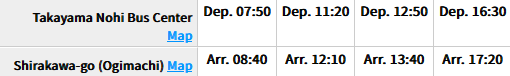 Pour vous y rendre, il faudra obligatoirement prendre le bus (ou la voiture), car aucune ligne de train n'arrive jusqu'au village. Depuis Takayama Station, le trajet en bus dure environ une heure.