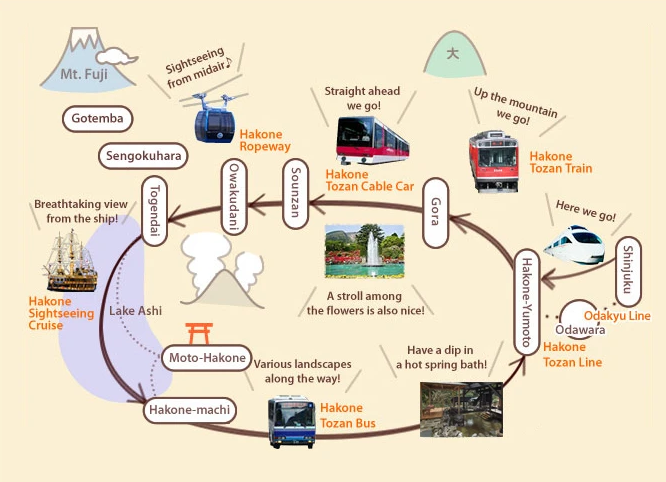 Pour visiter Hakone en toute liberté, le Hakone Free Pass est vraiment pratique: il donne un accès illimité à une multitude de transports (train, bus, funiculaire, téléphérique, bateau…), parfait pour explorer la région sans se poser de questions. Vous pouvez vous le procurer directement sur place (Shinjuku Station et Odawara Station) ou, à l'avance, en ligne sur le site officiel de la compagnie Odakyu.