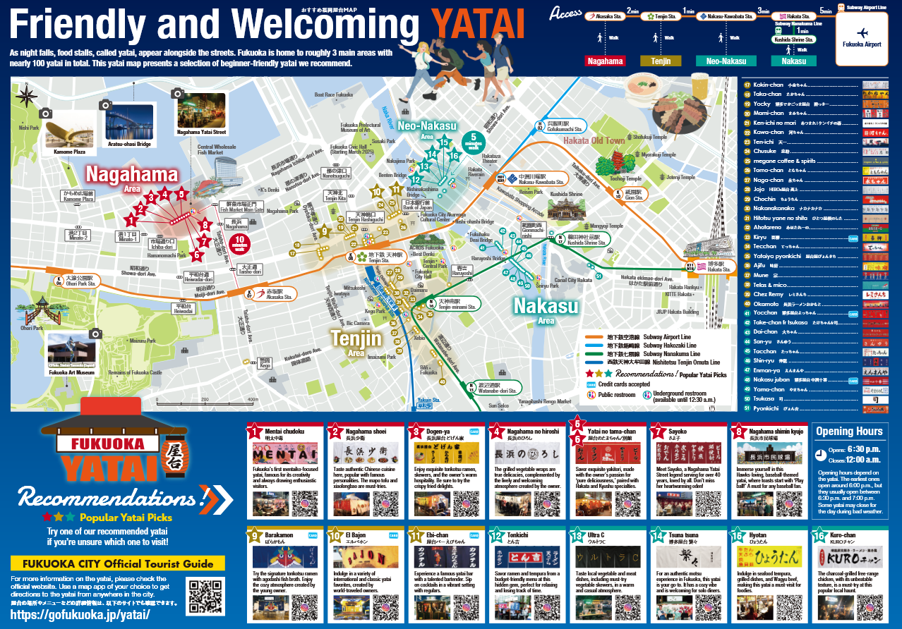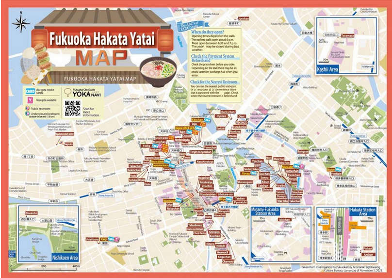 Même si chaque stand a sa spécialité, on retrouve le plus souvent : Hakata ramen (tonkotsu), yakitori, gyoza, oden (pot-au-feu japonais), tempura ou encore des bières et saké en tout genre.