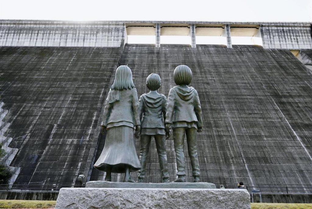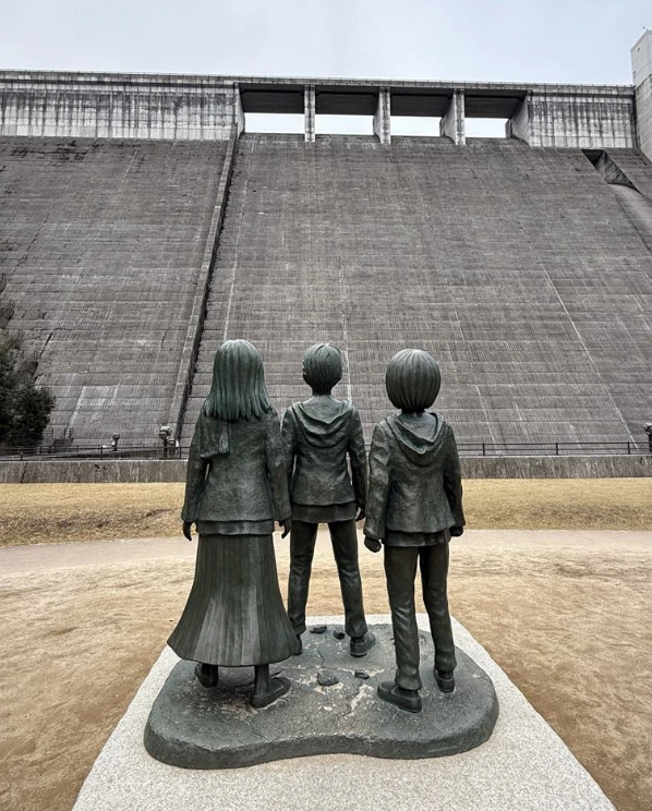 Mais ce qui attire aujourd'hui de nombreux visiteurs, ce sont les statues des personnages principaux du manga "L'Attaque des Titans" installées devant le barrage. Ce qui rappelle symboliquement les immenses murs de la série.