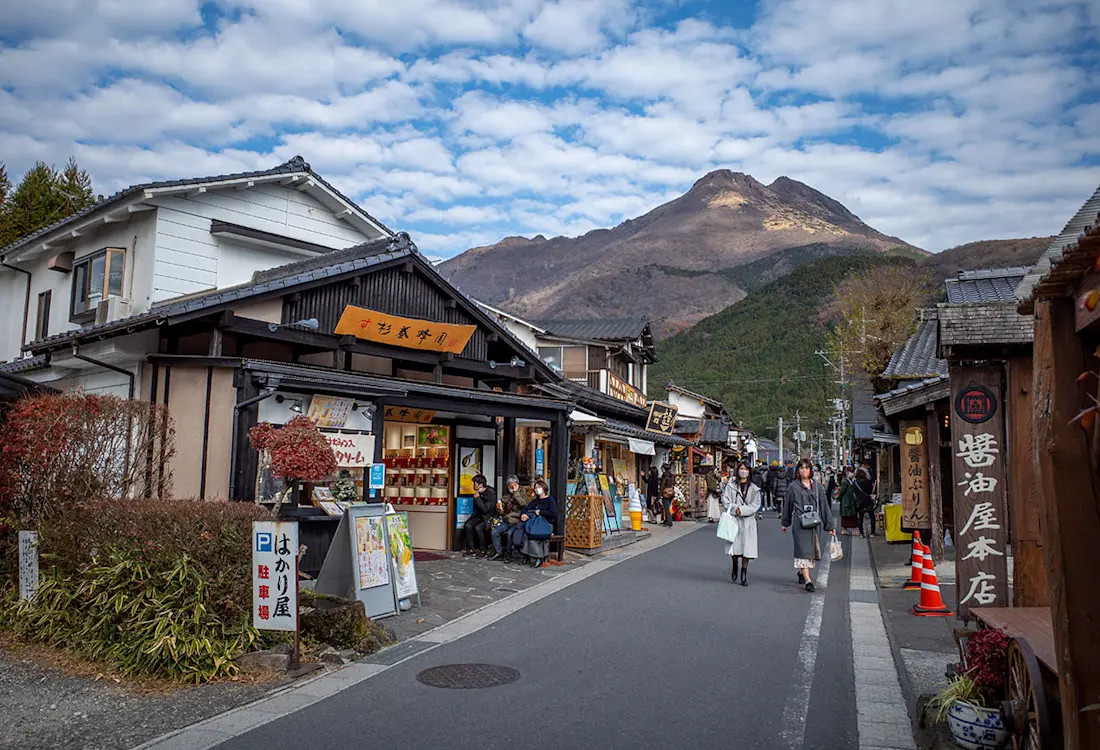 Les visiteurs peuvent se détendre dans des bains en plein air avec une vue imprenable sur le majestueux Mont Yufu. De nombreux ryokan traditionnels et hôtels modernes sont disséminés dans la région. Vous pouvez également profiter des bains en tant que visiteur d'un jour.