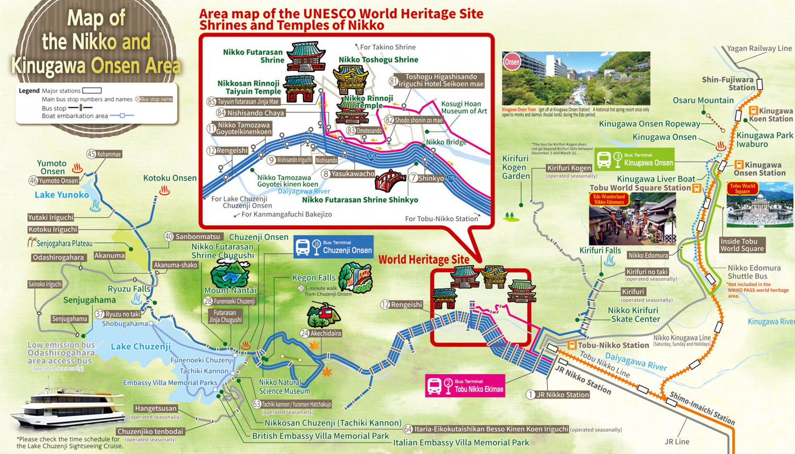 Le World Heritage Site comprend principalement trois complexes majeurs, tous situés à quelques minutes de marche les uns des autres, au cœur d'une jolie forêt de cèdres: le sanctuaire Tosho-gu, le sanctuaire Futarasan-jinja et le temple Rinno-ji.